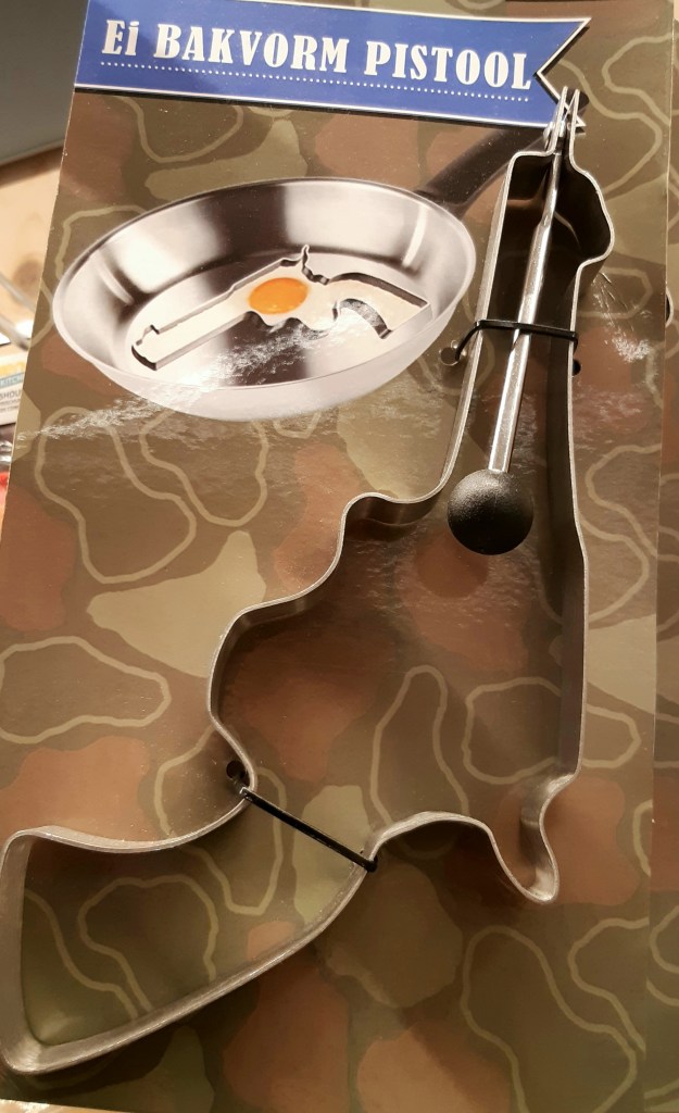 Om dan toch maar op dat laatste – mijn stokpaardje, per slot van rekening – in te gaan: waarom staan er in hemelsnaam twee spaties in de naam van dit product, waar het toch óverduidelijk is dat die als één woord geschreven zou moeten worden??! Want dan zou ik in elk geval nog kunnen overwegen om erin mee te gaan. Als dit gewoon een eibakvormpistool was, een pistool dat tevens een bakvorm is om een ei in te bakken, dan was er een heeeeeeeeel, maar dan ook echt een miniem klein kansje geweest dat ik hier vrede mee zou kunnen hebben. Maar nee, nu is het niet minder dan een affront, een gotspe. Meer kan ik er niet van maken. Of…..?????
